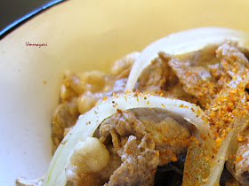 2.Add mixed spices (soy sauce, sake, sugar) and beef in the saucepan and cook on high heat.